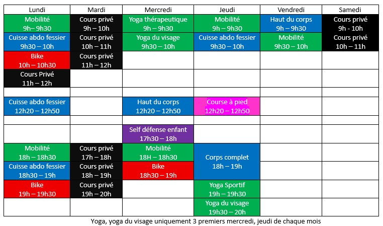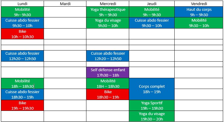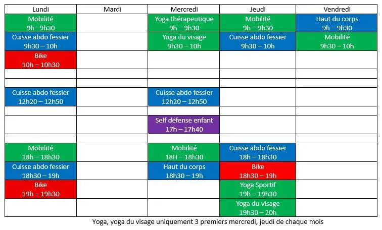 Pas de réservation pour les cours collectifs, venir 5mn avant le cours avec une bouteille d'eau, une serviette